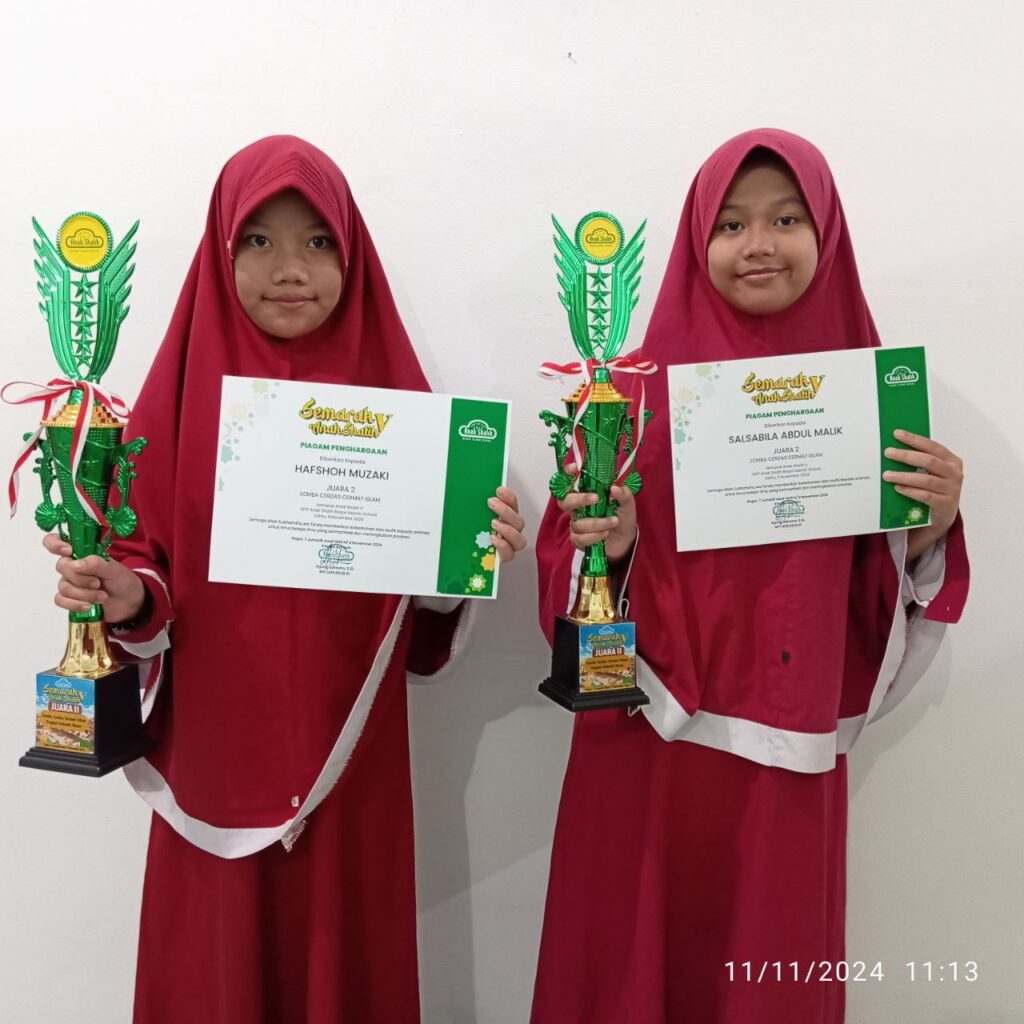 Bogor, 9 November 2024 – Prestasi membanggakan kembali ditorehkan oleh siswi SDIT SUIS Bogor, Hafshoh Muzaki (Siswi Kelas 5B) dan Salsabilah Abdul Malik (Siswi Kelas 6B) pada ajang bergengsi Semarak Anak Shalih V yang digelar di SD Anak Shalih Cimahpar, Bogor. Dalam acara yang berlangsung penuh antusias ini, siswi SDIT SUIS Bogor berhasil meraih Juara 2 dalam Lomba Cerdas Cermat Islami (CCI) mengalahkan 28 tim dari sekolah lain.
