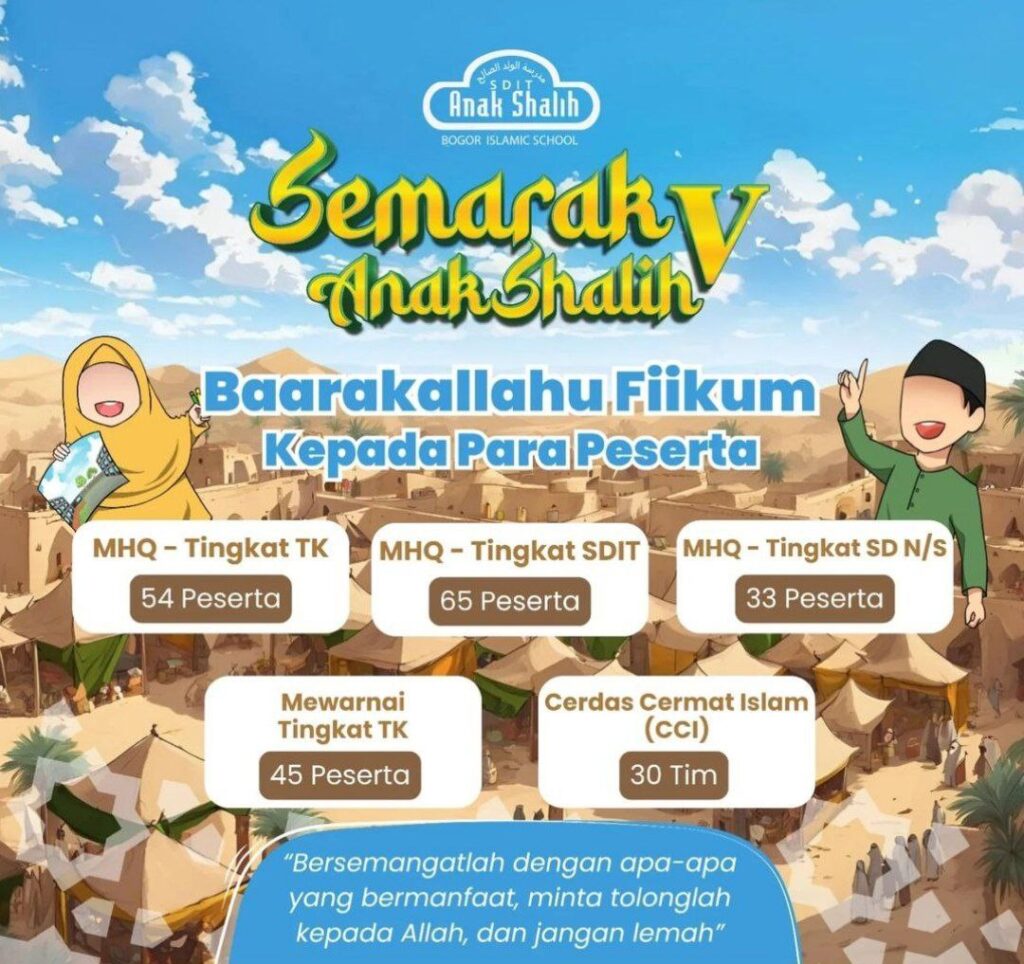 Event Semarak Anak Shalih V ini diharapkan dapat memotivasi anak-anak agar lebih mencintai pengetahuan dan meningkatkan pemahaman mereka tentang nilai-nilai Islam sejak dini. Selamat kepada siswi SDIT SUIS Bogor atas prestasi yang diraih!