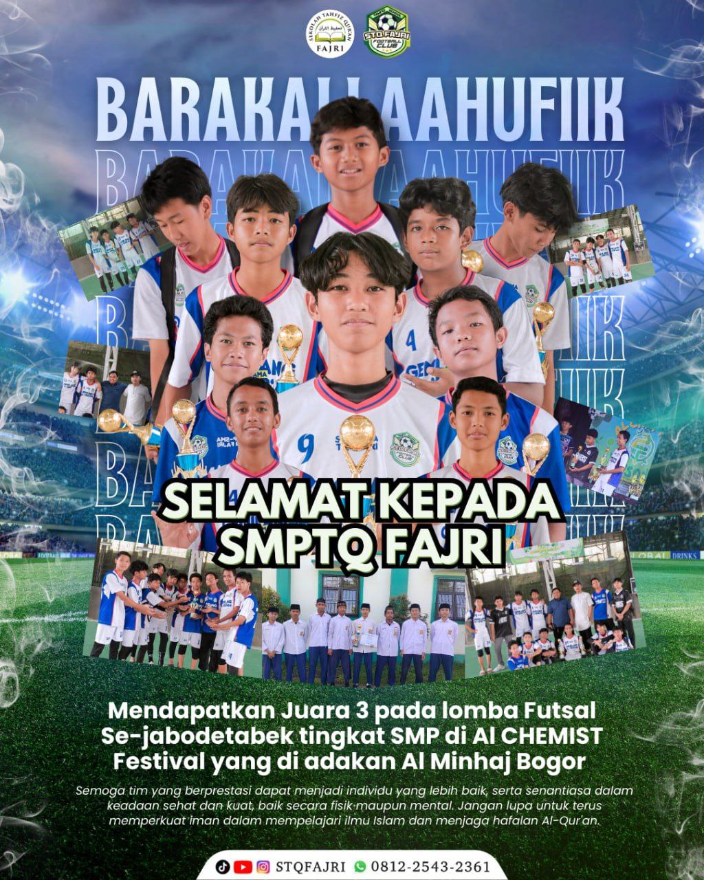 Bogor, 23 November 2024 – Alhamdulillah, Kabar gembira datang dari SMPTQ Hasmi Putra! Pada Sabtu, 23 November 2024, tim futsal ikhwan berhasil meraih Juara 3 dalam kompetisi Futsal Tingkat SMP se-Jabodetabek yang digelar di Pondok Pesantren Minhaj Shahabah. Ajang bergengsi ini diikuti oleh berbagai sekolah unggulan dari wilayah Jabodetabek, menjadikannya kompetisi yang sangat kompetitif.