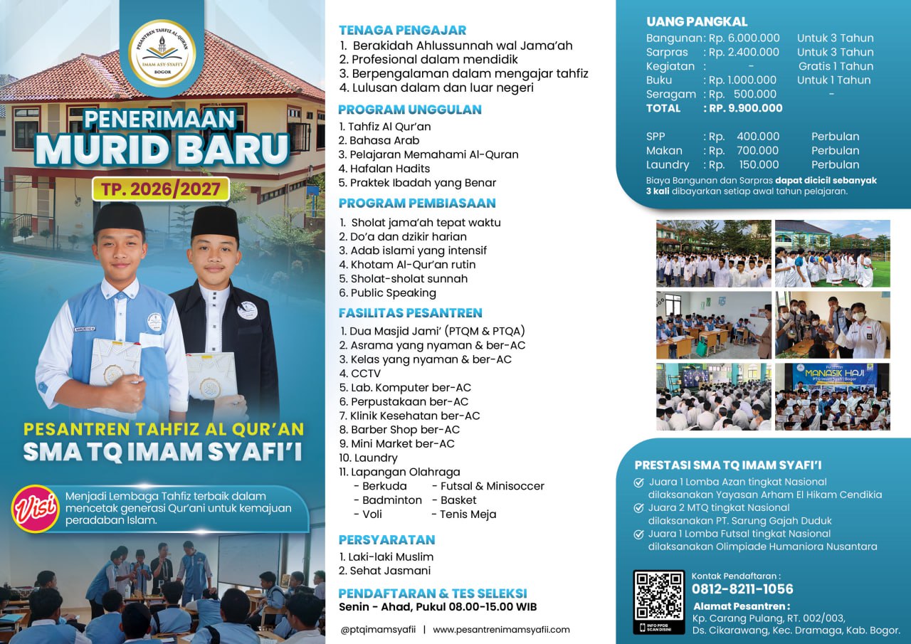"Pesantren Sunnah dengan biaya terjangkau. Baru satu bulan putra saya mondok, Alhamdulillah betah dan gak nyesel jadi santri PTQ Imam Syafi'i. Lokasi yang asri dg rute yg masih aman untuk kendaraan roda 2 dan roda 4."