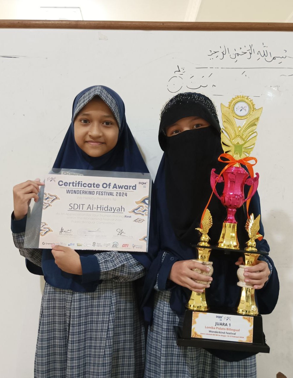 Alhamdulillah perwakilan SDIT Al Hidayah Cibinong atas nama Qonita Isman Taqiyya (kelas 4C) dan Tiara Aqila Mufidah (kelas 4C), kembali meraih Juara 1 Lomba Pidato Bilingual SD pada acara Wonderkind Festival tingkat nasional di SMP Darul Qur’an Mulia Parung Bogor, pada hari Kamis & Jum’at, 16-17 Februari 2024.